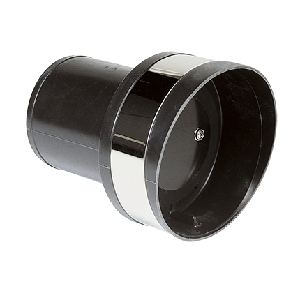 Transom exhaust connection for larger hose sizes on high performance engines. Synthetic material with high gloss stainless steel trim band.
